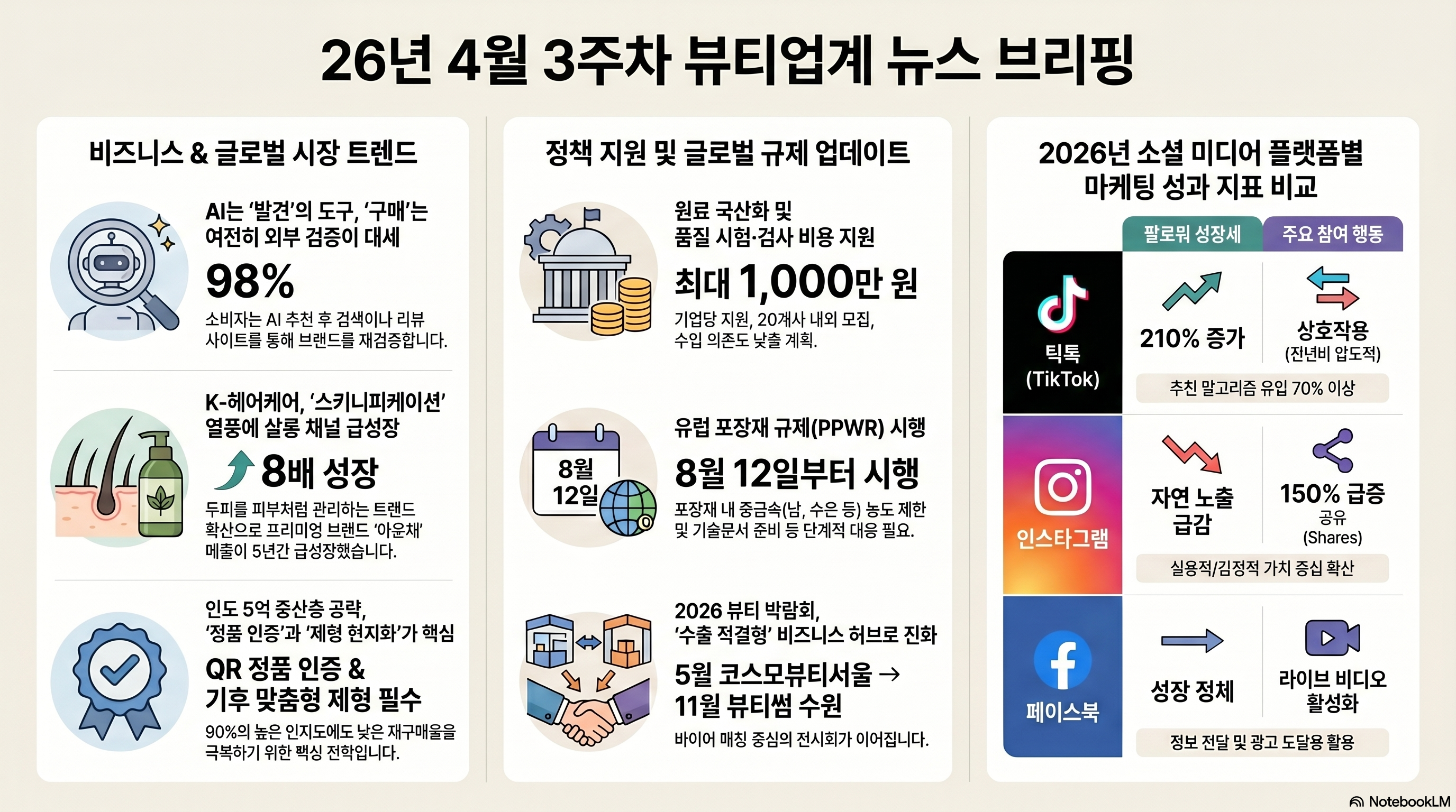 본 브리핑은 2026년 4월 3주차 뷰티 산업의 정책 변화, 글로벌 규제, 그리고 시장 역학 변화를 실무 관점에서 정리한 내용입니다. 브랜드 운영사와 창업가가 지금 바로 점검해야 할 정책, 수출 전략, 유통 구조, 소비자 인사이트를 중심으로 핵심만 정리했습니다.